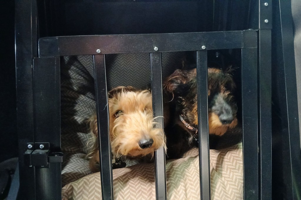 Crate we chose comes in multiple sizes, to accommodate everyone – from miniature Dachshunds to German Shepherds. We opted for the smallest size, which still gives them both room to lay down but also leaves some extra space in the trunk for other travel essentials we bring on our trips.